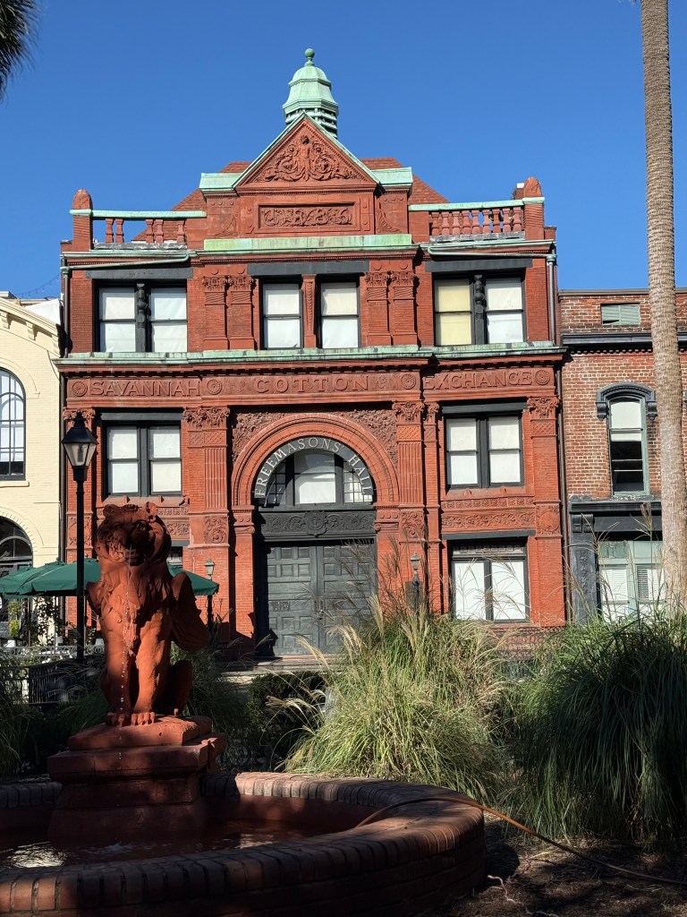 From there we took a pleasant walk down Bull Street to a little beyond Forsyth Park, total about 2 miles. The restored historic houses are a treat to see, and there is a “park”, or public square every two or three blocks, each dedicated to an important historical figure from Savannah’s past. This synagogue pictured below, built around 1830, represents a jewish community established in the early 1700’s. Like the Jews of Newport Rhode Island the Savannah jews received a letter from George Washington but unlike the more famous RI letter in which Washington writes – the children of Abraham should enjoy “the exercise of their inherent natural rights. For happily the Government of the United States, which gives to bigotry no sanction, to persecution no assistance, requires only that they who live under its protection, should demean themselves as good citizens” – the Savannah original is lost.