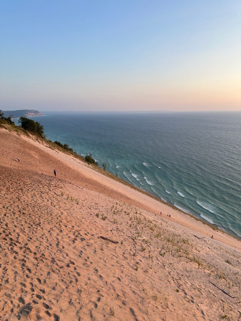 August 18, Left Petoskey SP and drove through both Petoskey and Traverse City. Beautiful small towns on the eastern shore of Lake Michigan. Ate brunch at Bayside restaurant in Petoskey. Finished the day at Sleeping Bear NLS. Campground was full of course so we found a spot in a county park called Empire CG then we drove the scenic drive within Sleeping Bear. Each scenic overlook was nice but the last stop was spectacular. About 450 ft above Lake Michigan atop a sand dune, we watched the sun set.
