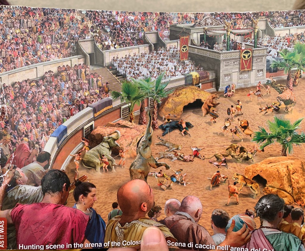 A Recreation of a 50 50 fight animals vs men, a common event. Notice the coliseum seats are a continuous circle of marble and brick, the wooden floor covered with sand. The gladiators were not allowed to turn their backs on the emperor so must fight the animals facing him or be punished. A referee wearing a white shirt with blue stripes called fouls and decided the punishment