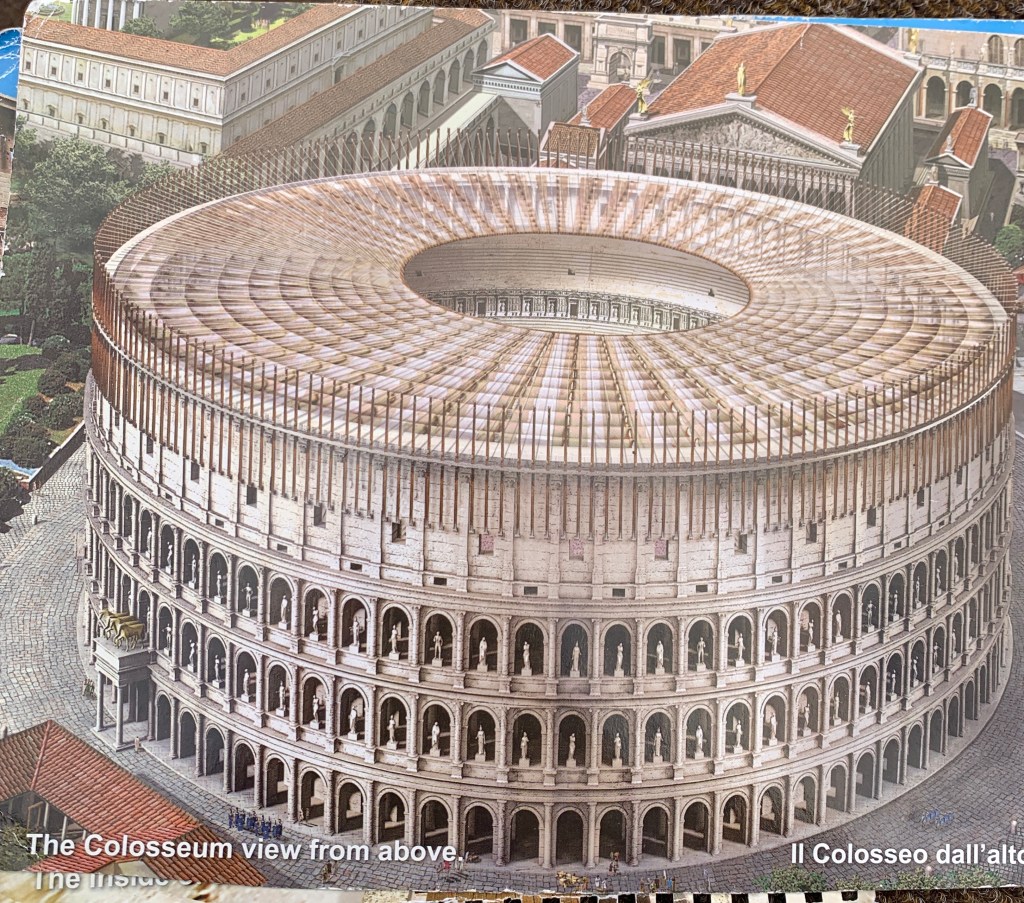 After lunch at Osteria delle Comare we took a cab to The Coliseum and Roman Forum. We were to meet at the Arch of Constantine at 3:00. At 2:54 I started to panic when one minute later a woman with a yellow flag showed up and 10 other people instantly congregated around her. Our guide was a 45 yo former professor who had a PhD in anthropology. Originally from Rome, he lived in England, Columbia, Peru and Brazil. The latter two countries were as part of his phd work. He lived with an indigenous tribe in the Amazon for a year, knows that language as well as being fluent in Italian, English and Portuguese. The four hour 15 minute tour was 3hrs 55min on the colisseum, 20 min forum. The coliseum could seat 70,000, was free and bread was handed out free. Built between 70 and 80 AD by Vespasian and his son Titus, it was used as entertainment for the people of Rome, entertainment that usually included death of many animals and people. The seats were marble or brick, it had a retractable canvas roof. Here are some pictures and recreations of the original as it is really hard to imagine how it was from the ruins: