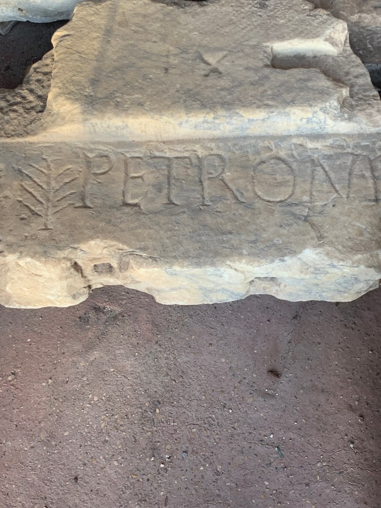 one of those marble seats with a 2,000 year old name of the patron family still easily read