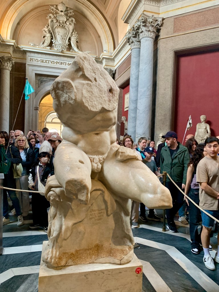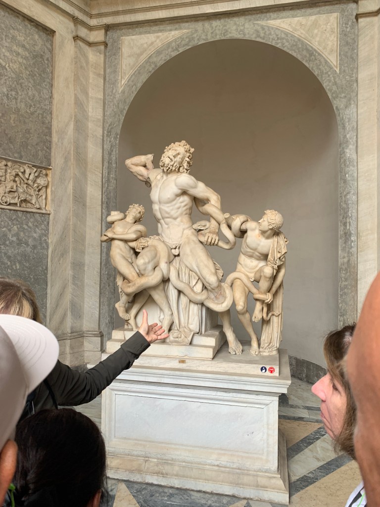 We payed a little more for the “VIP skip the lines tour”, well worth it. 12 people is all there were in our tour and the guide was really good. She cares deeply about art, and knew so much. She was bossing us and total strangers around the whole tour “don’t stand there you’re blocking the aisle”, “there is a time limit here you must move on”. And she herded us like we were sheep and she a border collie. We sped through the vatican museum first. Her theme was to show us Michaelangelo’s influences. The greek statues of Apollo are his models for Jesus, Hercules is God the father, a statue of Glaucus is the model for the face of agony (hell). Here are some pictures: