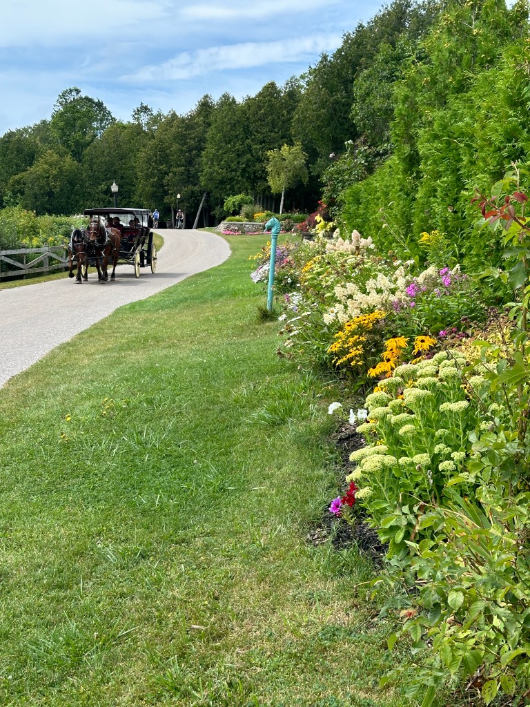 Saturday August 17 Ferry over to Mackinac Island, only 4 miles wide the island is famous for not allowing cars, everyone walks, bikes, rides a horse or takes a horse drawn carriage/taxi. This was the location of an important fort in colonial period to shortly after the war of 1812, known as Machilimacinac (spelling varies), it changed hands from French, to English to American. Very touristy, of course, beautiful landscaping, lots of flowers everywhere, we spent about 6 hrs walking around and eating lunch (at Kingston Kitchen). Here are some pictures to give an idea of what it is like………