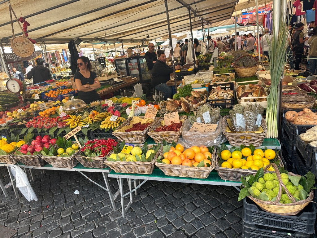 One shot of the huge outdoor market in the piazza created on the ruins of Pompey’s amphitheater . Ristorante Pancrazio is behind the photographer
