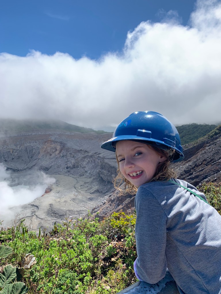 Took them to city mall to eat lunch, then we drove to Hotel Altura, which is very near our first site to visit, Poas Volcano. At a mile across, it’s the largest active volcano crater in the world (or so they said). Occasionally the pressure from below exceeds the weight of the water above and it “spews” ash and rock as much as 800 ft, but since the crater pool is 1,200 ft down you’re pretty safe. We were all required to wear a hard hat. There are gas vapor monitors at the crater edge and the smell of sulphur hovers all around. A guest at Hotel Altura told us they had pebbles fall on their heads (Luna 10yo) and one woman (Luna’s great aunt) said the sulphur smell was too much for her, she had to leave immediately. You are only allowed to stay there 20 minutes.