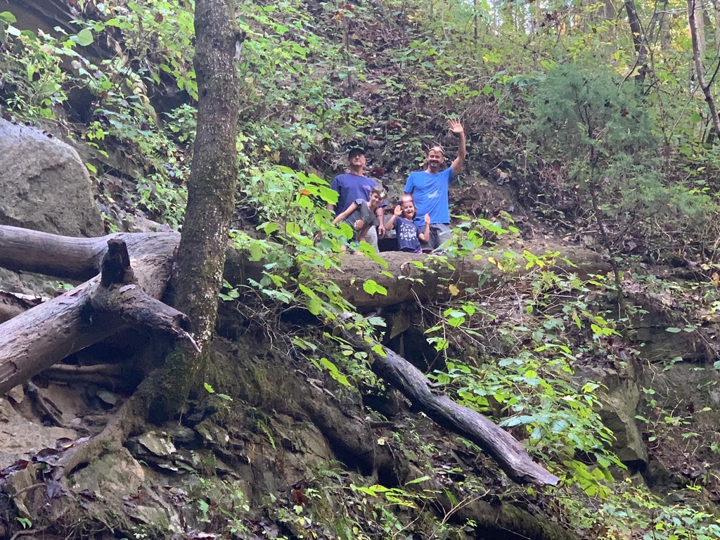 Spring Mill is a beautiful park, maybe Indiana’s best. We arrived late in the afternoon of the 7th. Will made pork chops Thursday evening, delicious. The crowd of campers grew Friday and Saturday commensurate with the Halloween decorations. Halloween is big with the camping crowd. Friday we hiked to Donaldson Cave, Noel, AK, Will and I climbed up the short cliff wall to enter and explore. Eagle eyed Anne Kash found a cave salamander. Here’s a picture of us emerging from a window into the cave above the stream that flows out of it: