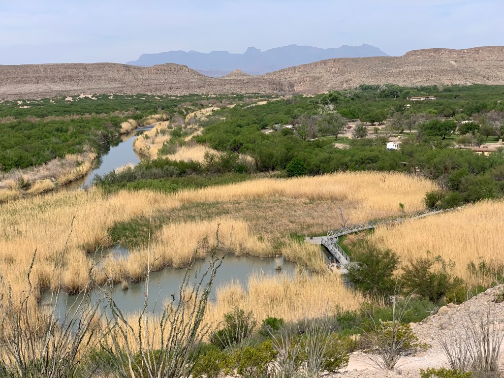 It’s roughly 40 miles from the entrance to Rio Grande village. The landscape is Creosote shrubs, Yucca and Prickley pear cactus, then suddenly you come over a slight hill and look down on a green strip of land dominated by cottonwood trees, willows and cattails. The Rio Grande creates a 1/4 mile strip of green on either side. Here are some pictures…..
