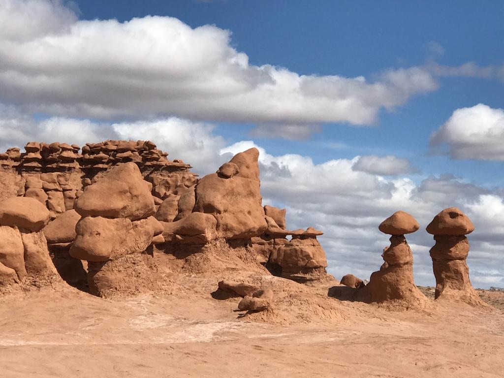 The first person of European heritage to see them called this Mushroom Valley, but the Native Americans had called it Valley of the Goblins in there language, so that’s what the place eventually came to be called. Apparently this area was once a sand dune covered shore of a vast inland sea. The sand dunes were compressed into soft sandstone. As wind and water, very little water note the almost complete lack of vegetation, eroded the soft sandstone, hardened areas within the dunes remained to create these weird structures.